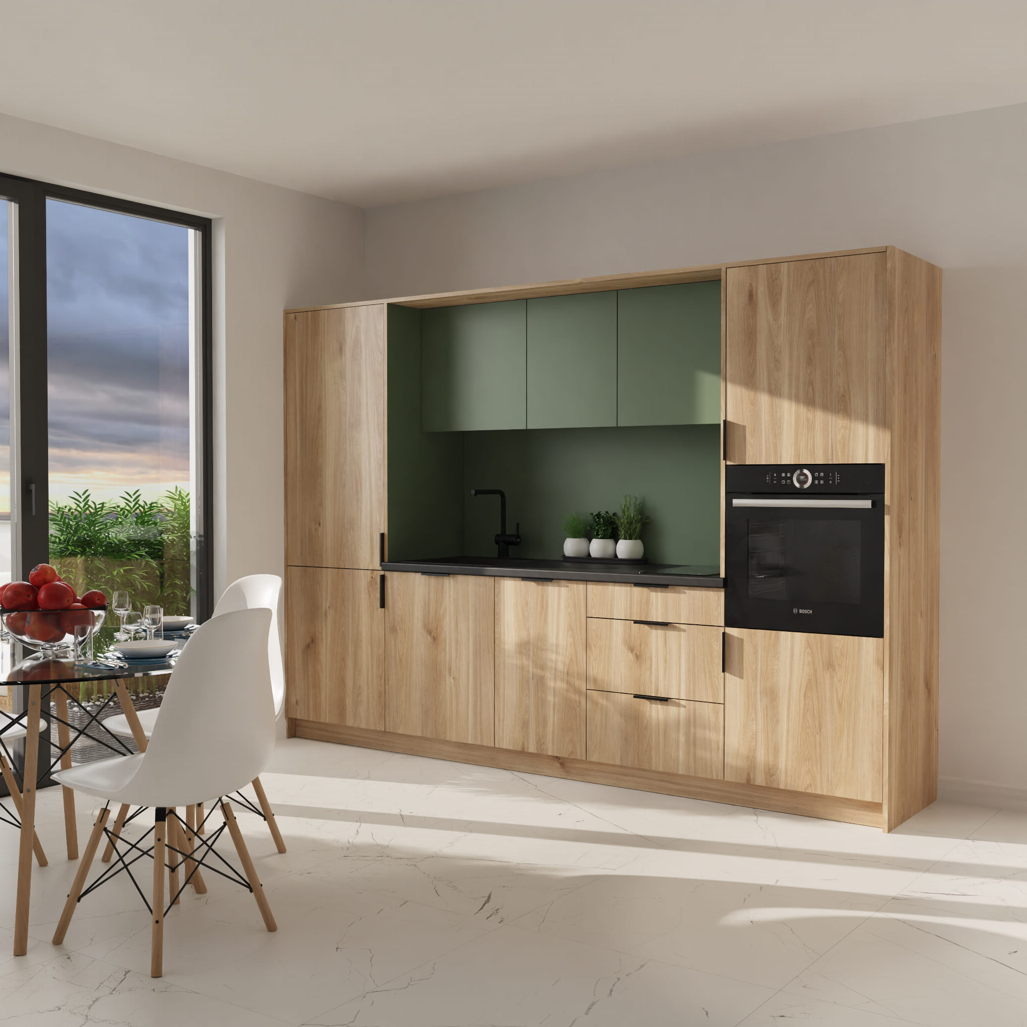 Duża kuchnia gotowa do montażu - Dab Castello Miodowy + dymiona zieleń
